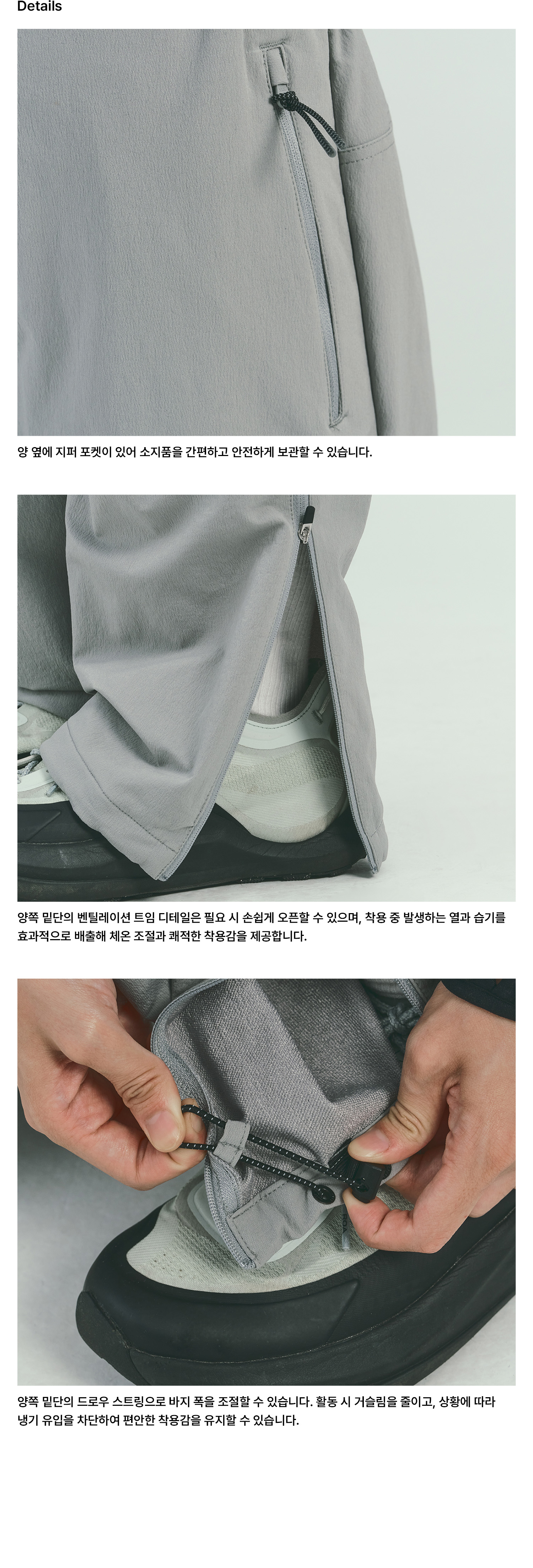 원단은 나일론·스판 혼방의 립스탑 스트레치(230gsm)로, 적절한 두께감 덕분에 여름을 제외한 3계절에 두루 착용하기 좋습니다. YKK 지퍼와 Woojin Plastic 부자재를 사용해 완성도를 높였으며, 밑단 지퍼 벤틸레이션과 3M 재귀반사 드로우 스트링, 재귀반사 프린트 디테일이 더해져 기능성과 스타일을 동시에 갖추었습니다.