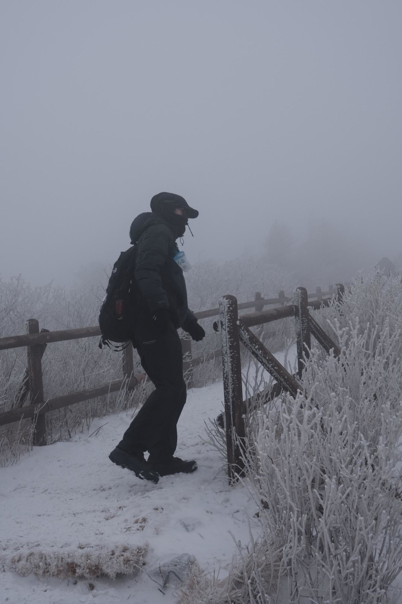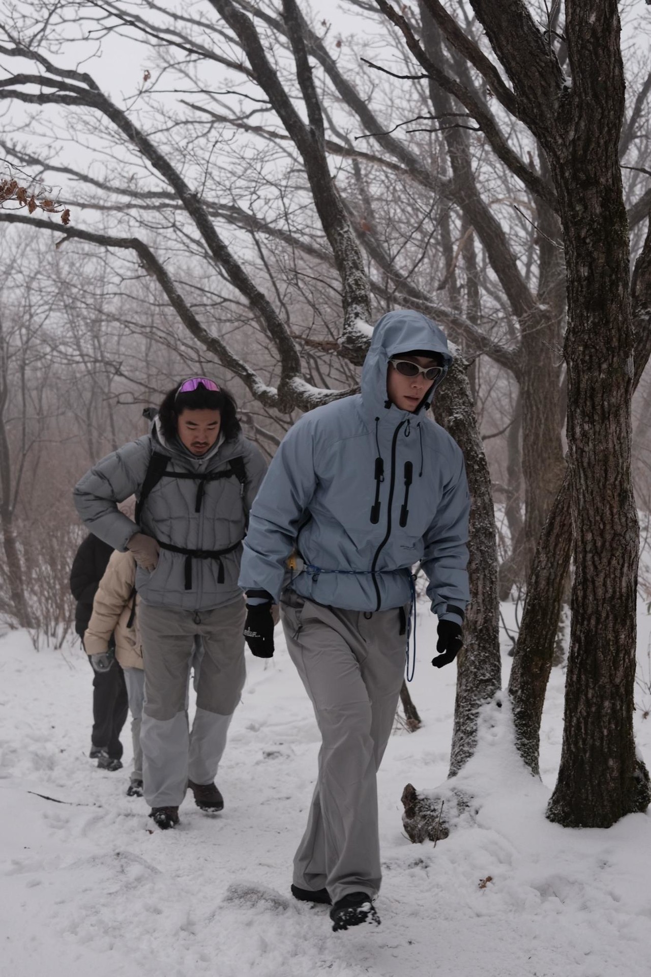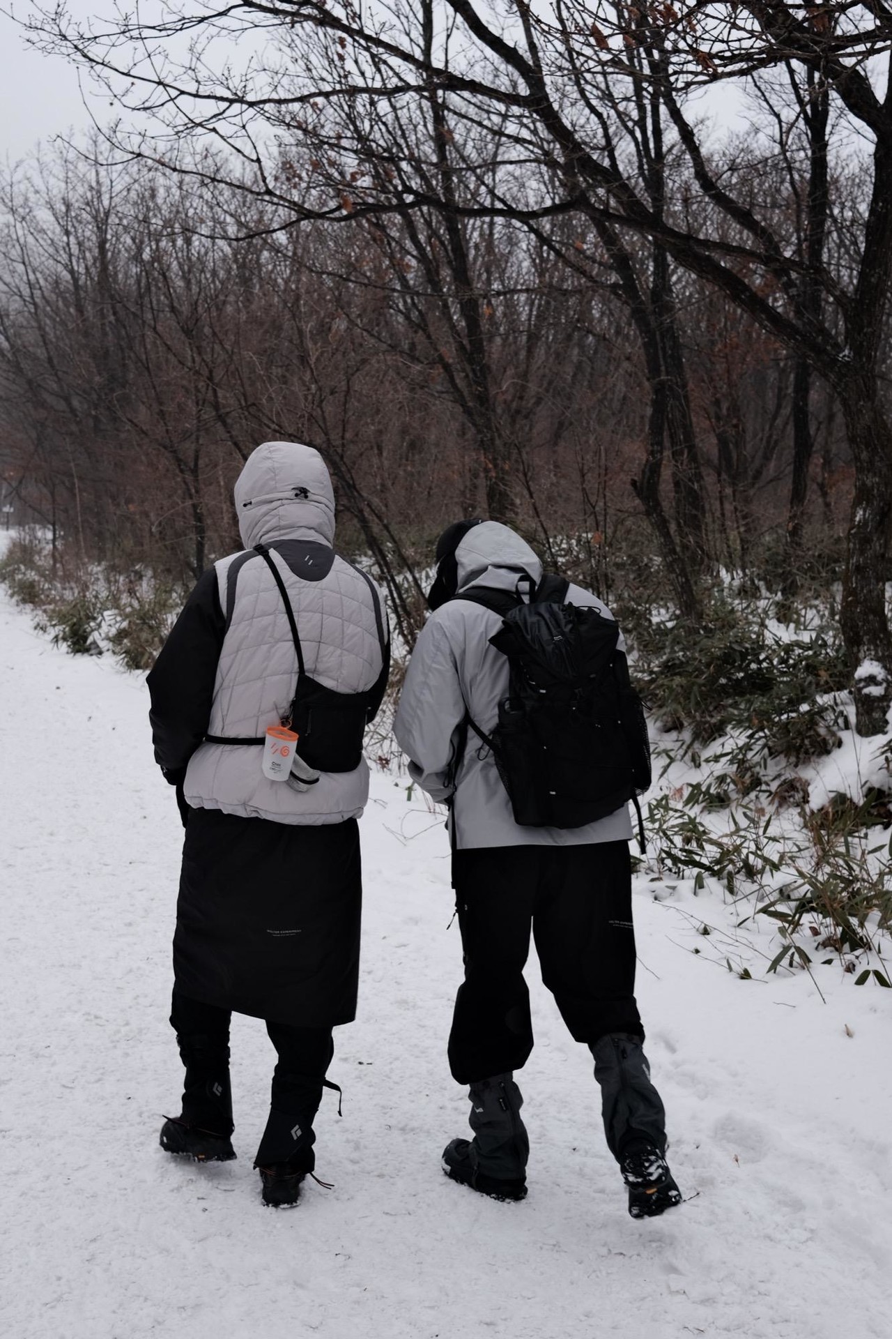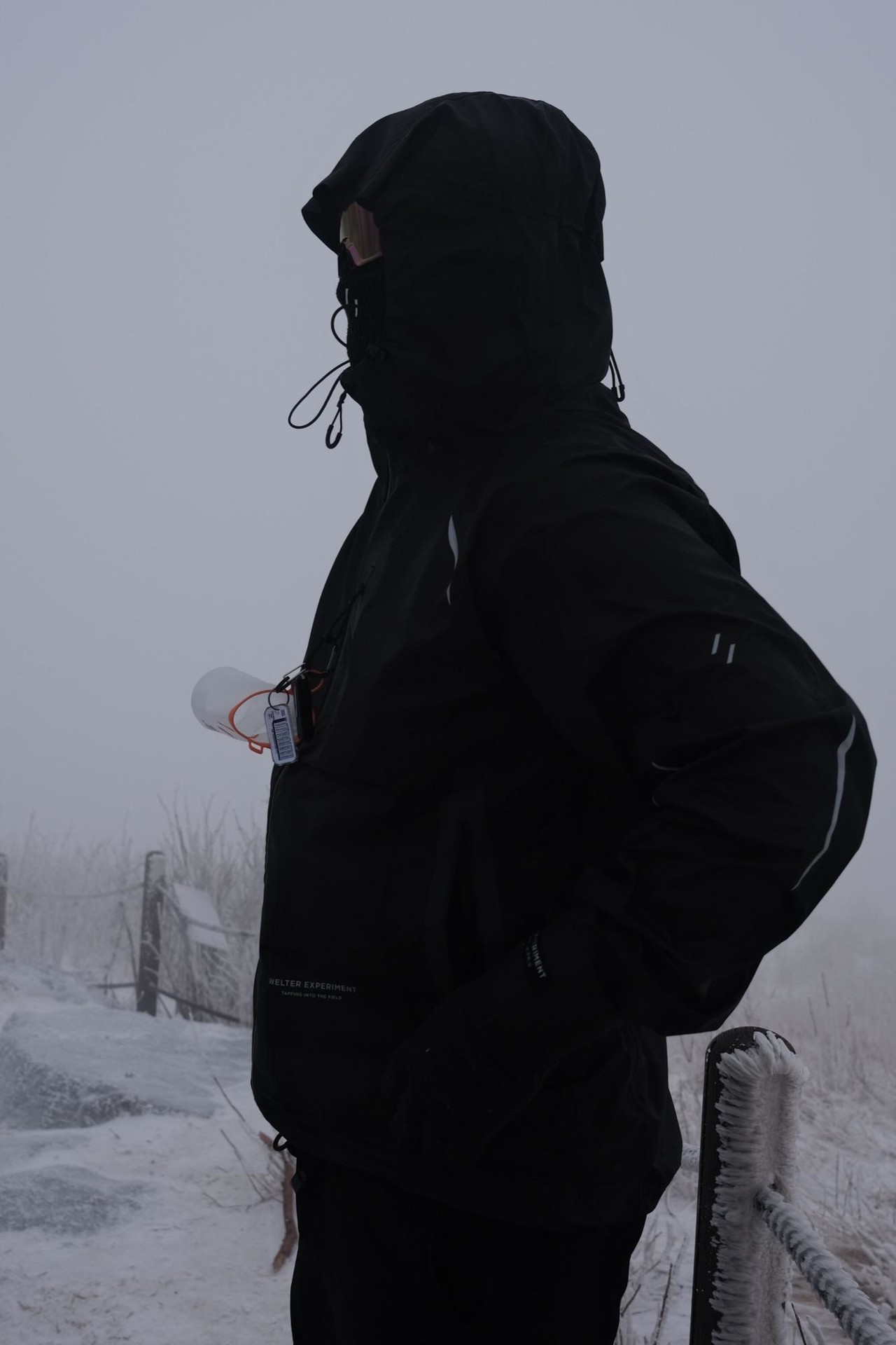 눈으로 덮인 함백산 설산 환경에서 3LAYER SLIT REFLECTIVE HARD SHELL JACKET을 착용하고 하이킹을 진행했습니다. 실제로 저는 하드쉘 착용을 선호하지 않아 망설였는데,