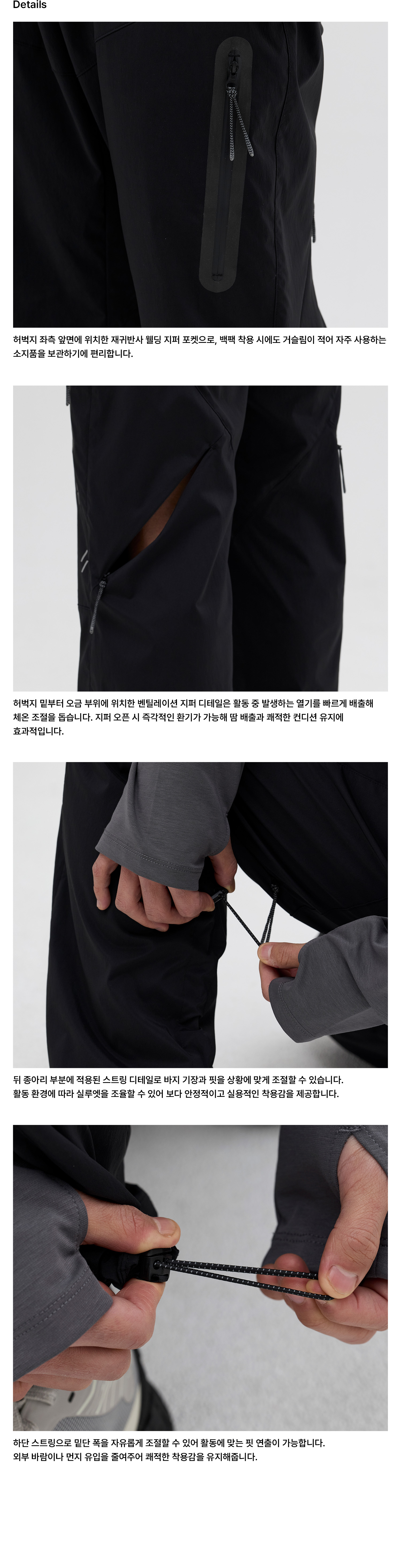 허리 조절 벨트와 지퍼 포켓 디테일로 실용성을 높였으며, 벤틸레이션 지퍼를 적용해 통기성을 강화해 활동 중에도 쾌적한 착용감을 유지합니다.