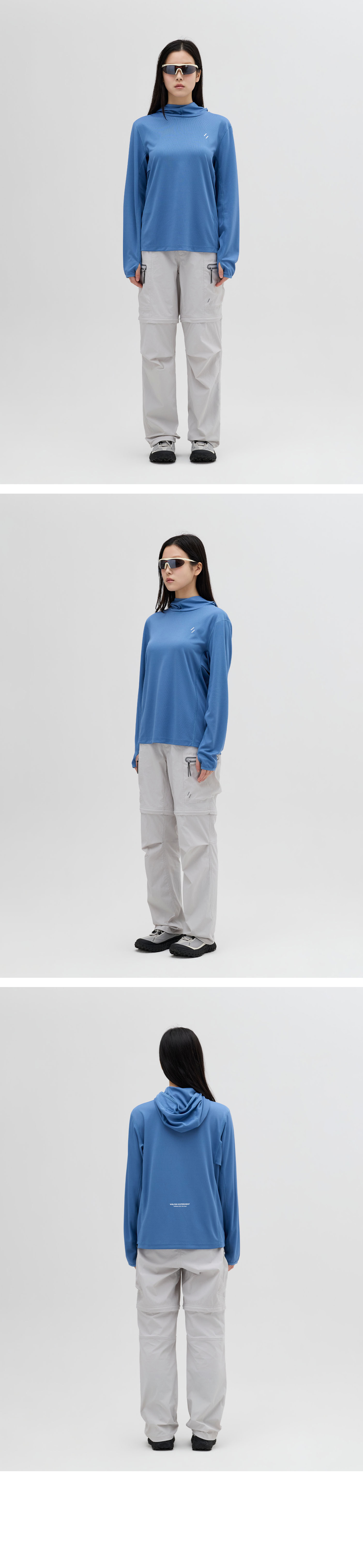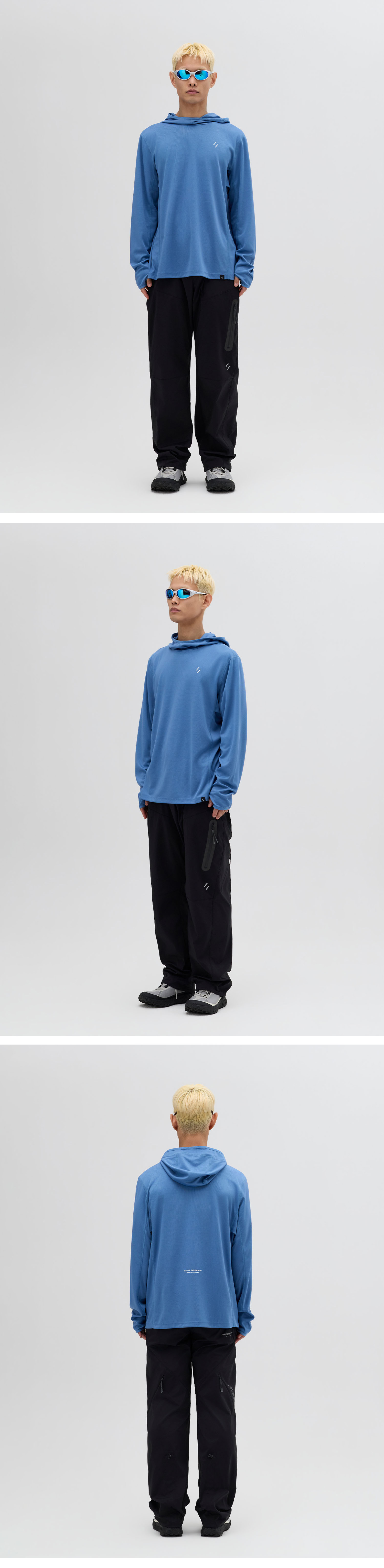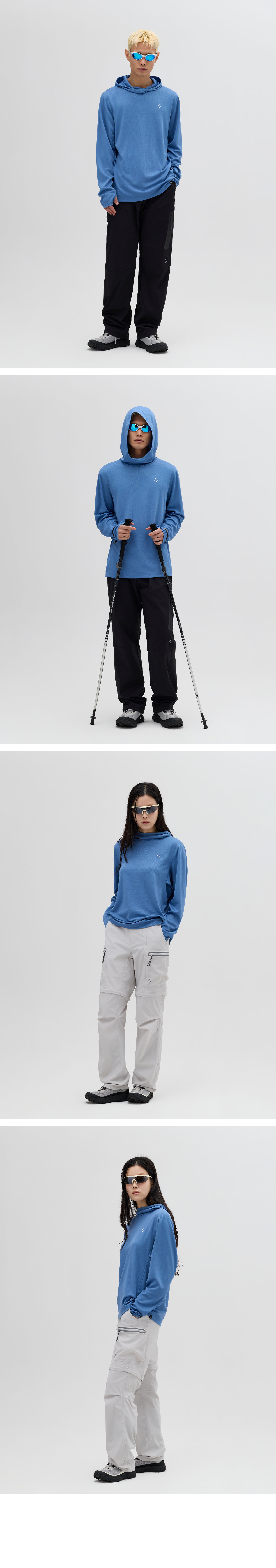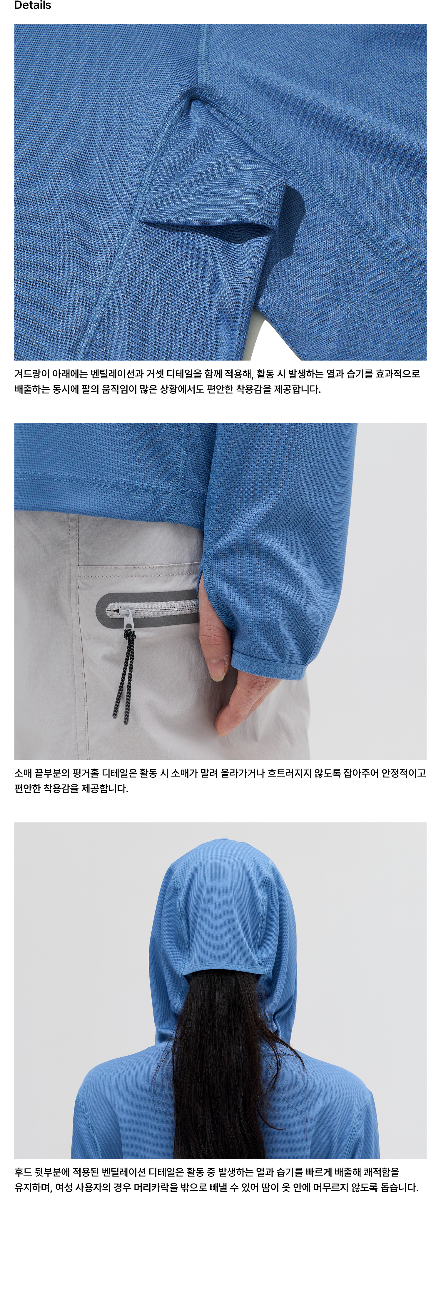 후드 뒤에 적용된 벤틸레이션 디테일은 통기성을 높이는 동시에, 여성 착용 시 머리를 묶은 상태에서도 자연스럽게 외부로 빼낼 수 있도록 설계되었습니다.