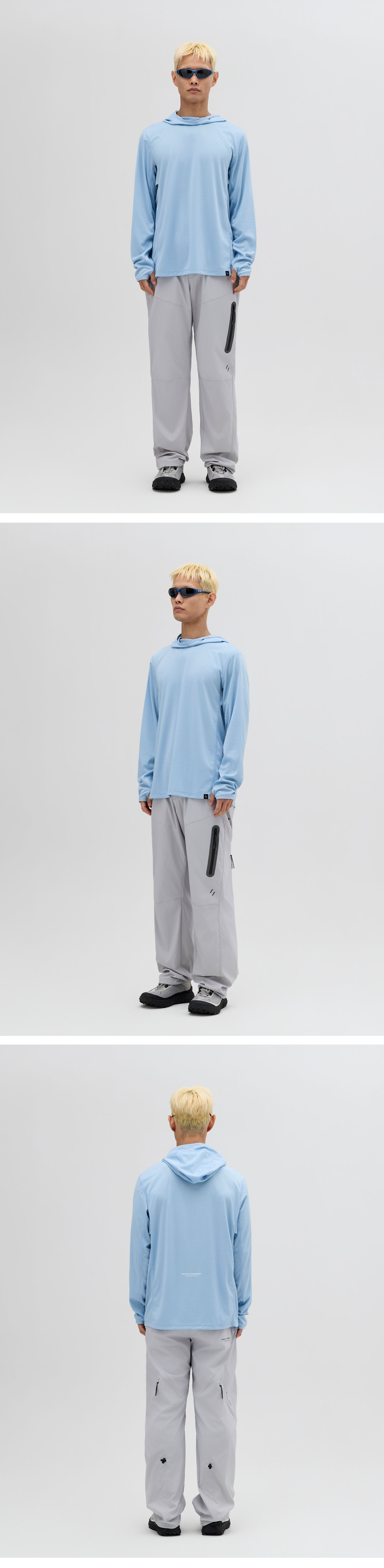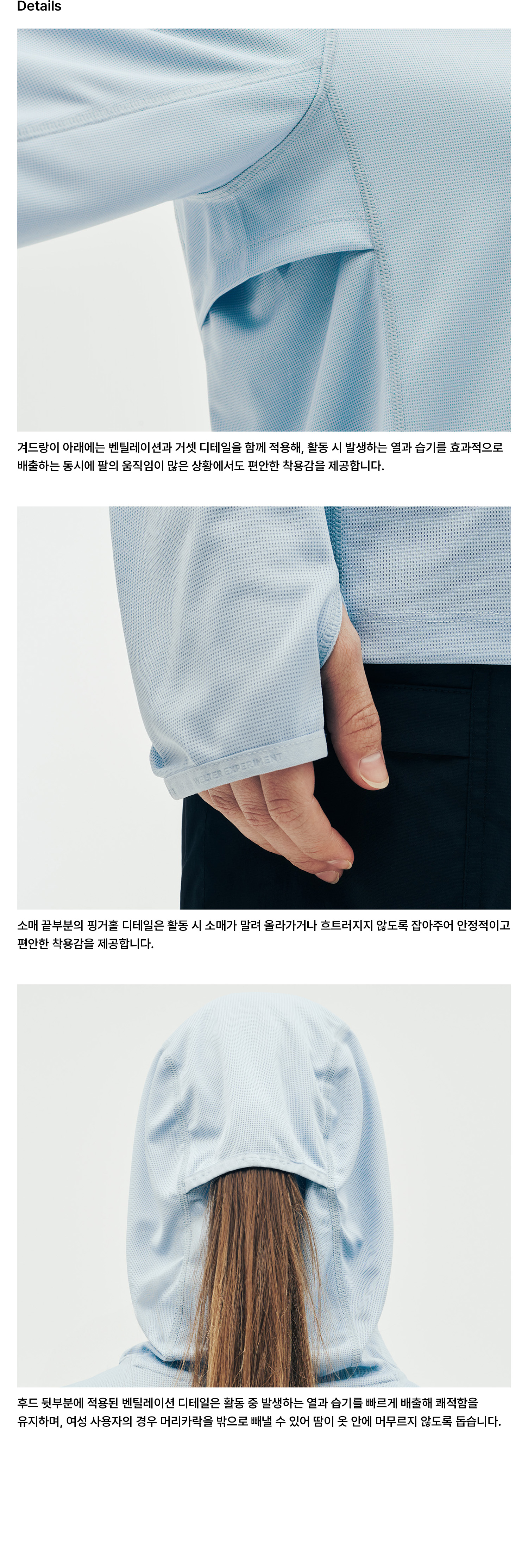 후드 뒤에 적용된 벤틸레이션 디테일은 통기성을 높이는 동시에, 여성 착용 시 머리를 묶은 상태에서도 자연스럽게 외부로 빼낼 수 있도록 설계되었습니다.