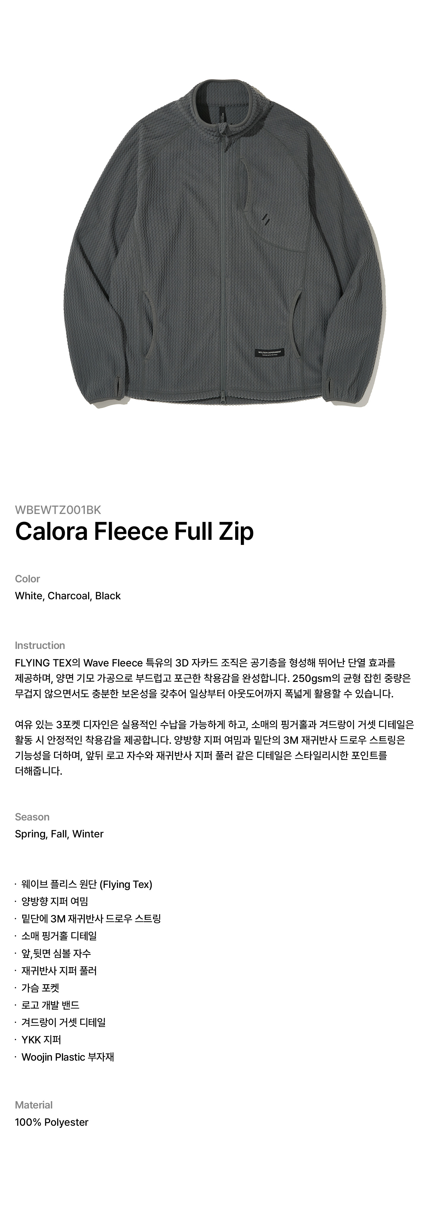 FLYING TEX의 Wave Fleece 특유의 3D 자카드 조직은 공기층을 형성해 뛰어난 단열 효과를 제공하며, 양면 기모 가공으로 부드럽고 포근한 착용감을 완성합니다. 250gsm의 균형 잡힌 중량은 무겁지 않으면서도 충분한 보온성을 갖추어 일상부터 아웃도어까지 폭넓게 활용할 수 있습니다.