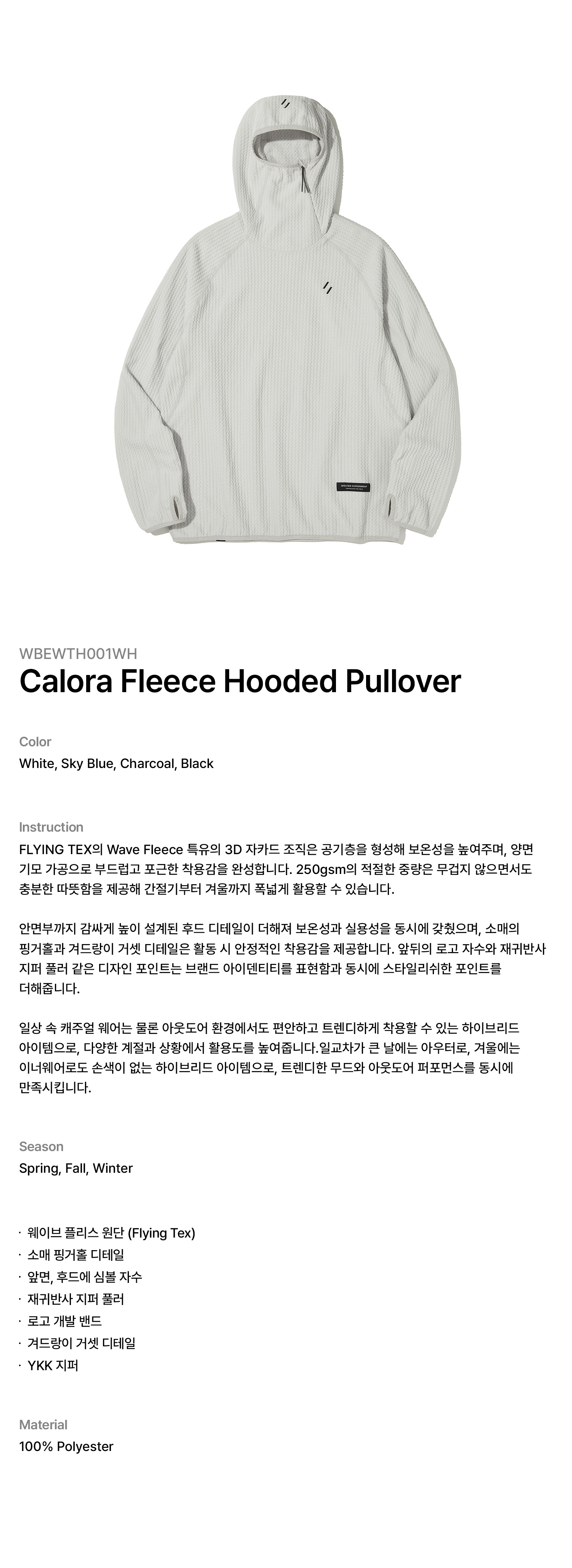 FLYING TEX의 Wave Fleece 특유의 3D 자카드 조직은 공기층을 형성해 보온성을 높여주며, 양면 기모 가공으로 부드럽고 포근한 착용감을 완성합니다. 250gsm의 적절한 중량은 무겁지 않으면서도 충분한 따뜻함을 제공해 간절기부터 겨울까지 폭넓게 활용할 수 있습니다.