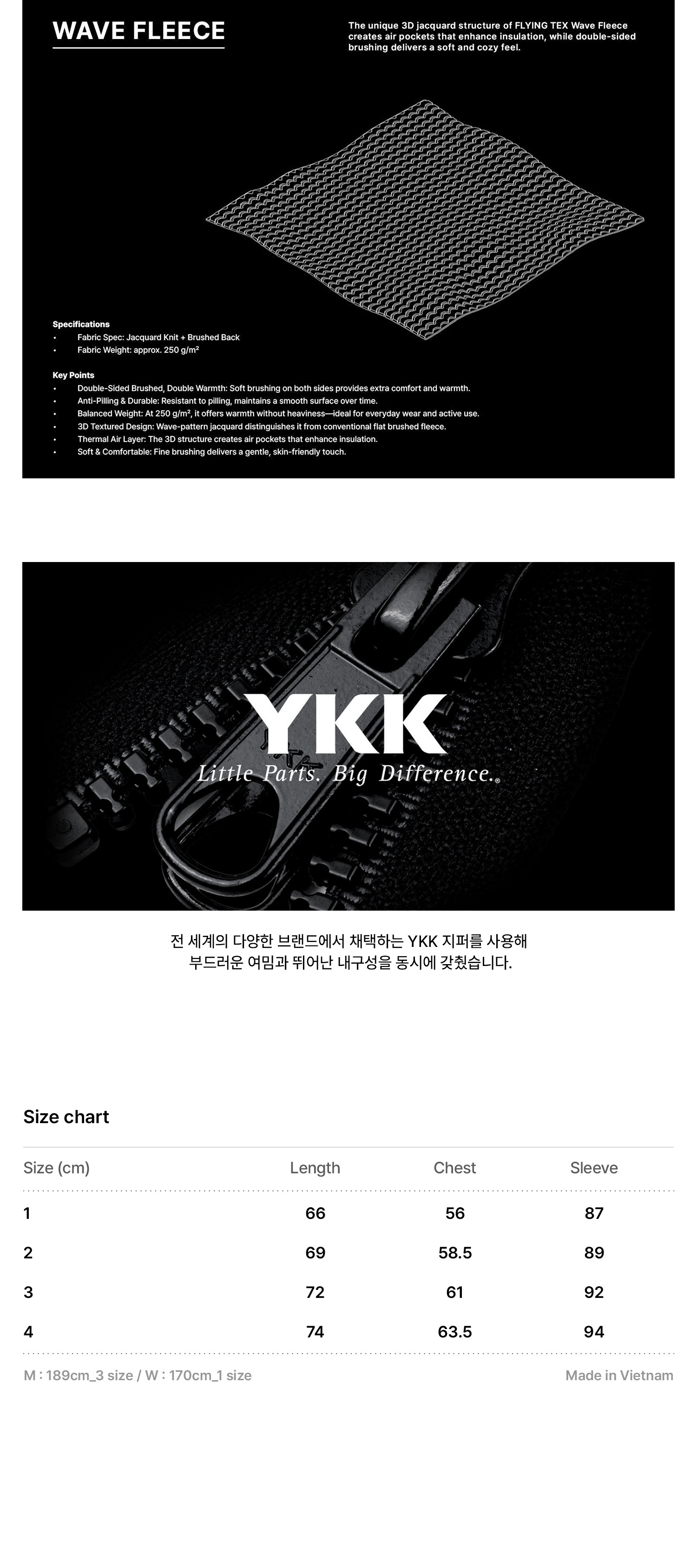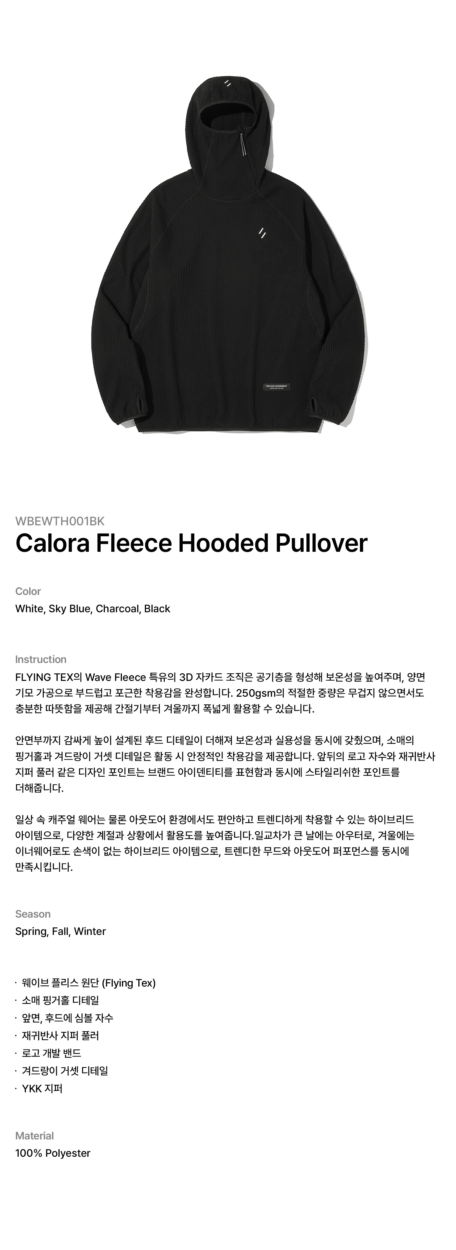 FLYING TEX의 Wave Fleece 특유의 3D 자카드 조직은 공기층을 형성해 보온성을 높여주며, 양면 기모 가공으로 부드럽고 포근한 착용감을 완성합니다. 250gsm의 적절한 중량은 무겁지 않으면서도 충분한 따뜻함을 제공해 간절기부터 겨울까지 폭넓게 활용할 수 있습니다.