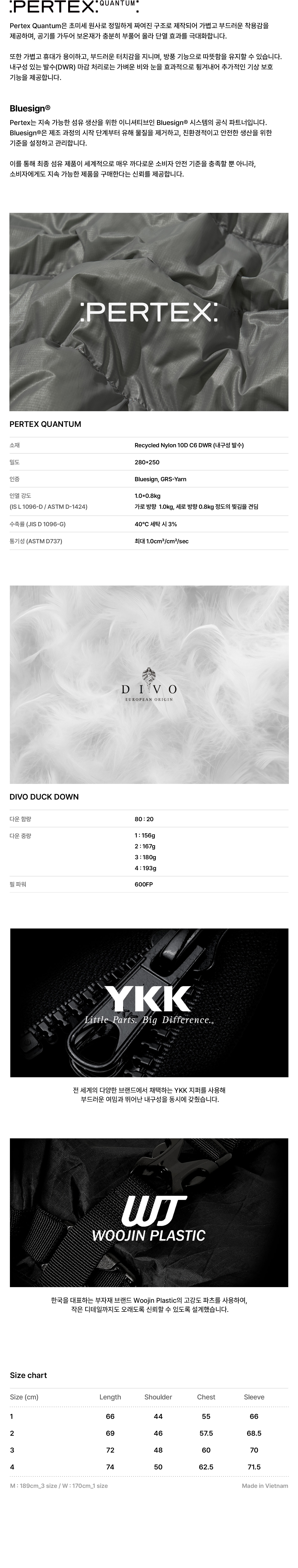 변덕스러운 날씨와 다양한 아웃도어 활동, 그리고 일상까지 모두 커버할 수 있도록 기획된 라이트 다운입니다. PERTEX® QUANTUM 리사이클 나일론 원단과 DIVO 덕다운 충전재를 사용해 가볍지만 따뜻하고, 내구성까지 겸비한 아우터로 완성했습니다. 일교차가 큰 계절이나 겨울철까지도 부담 없이 꺼내 입을 수 있으며, 작은 파우치에 패킹해 언제든 간편하게 휴대할 수 있습니다.