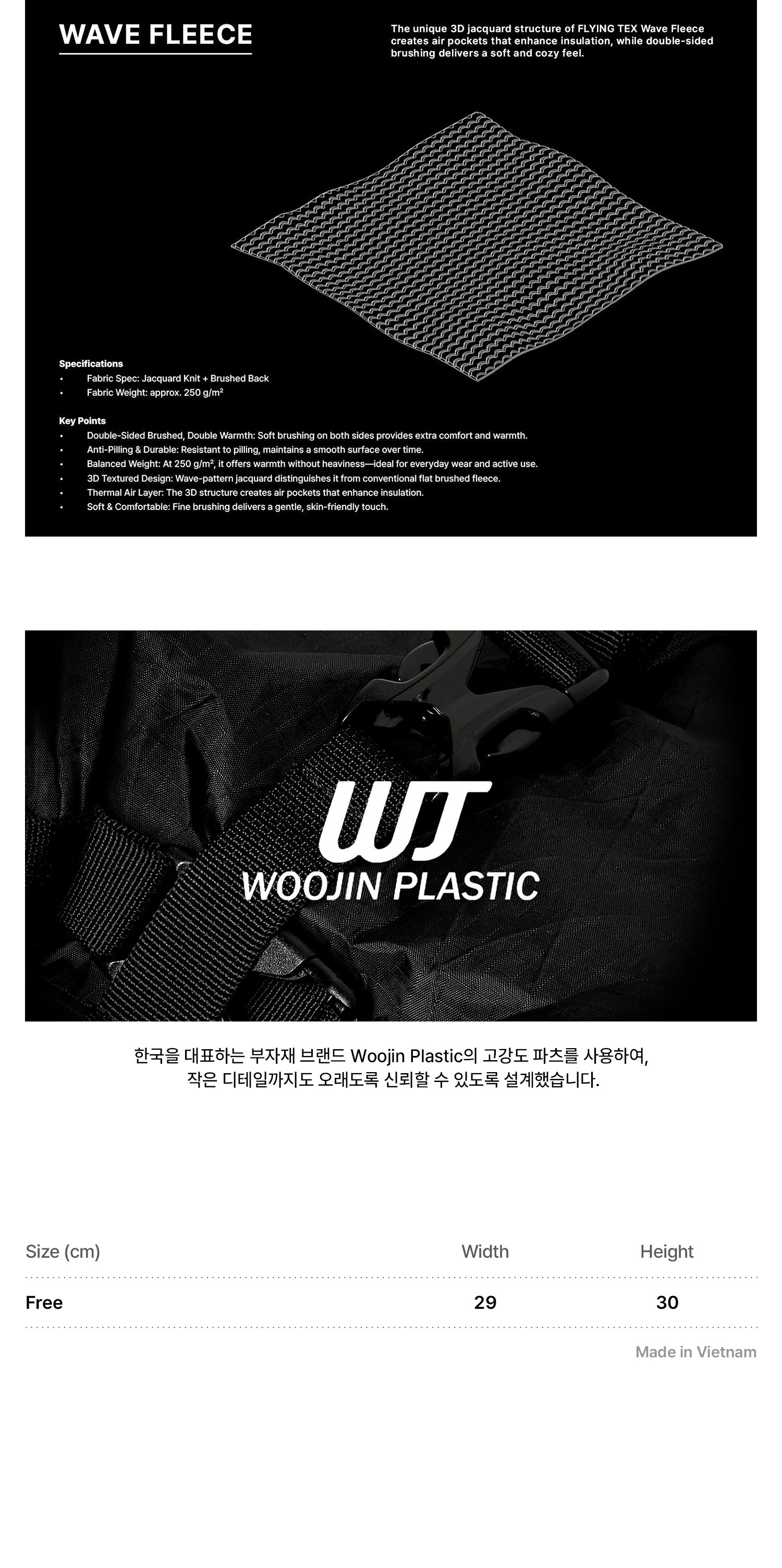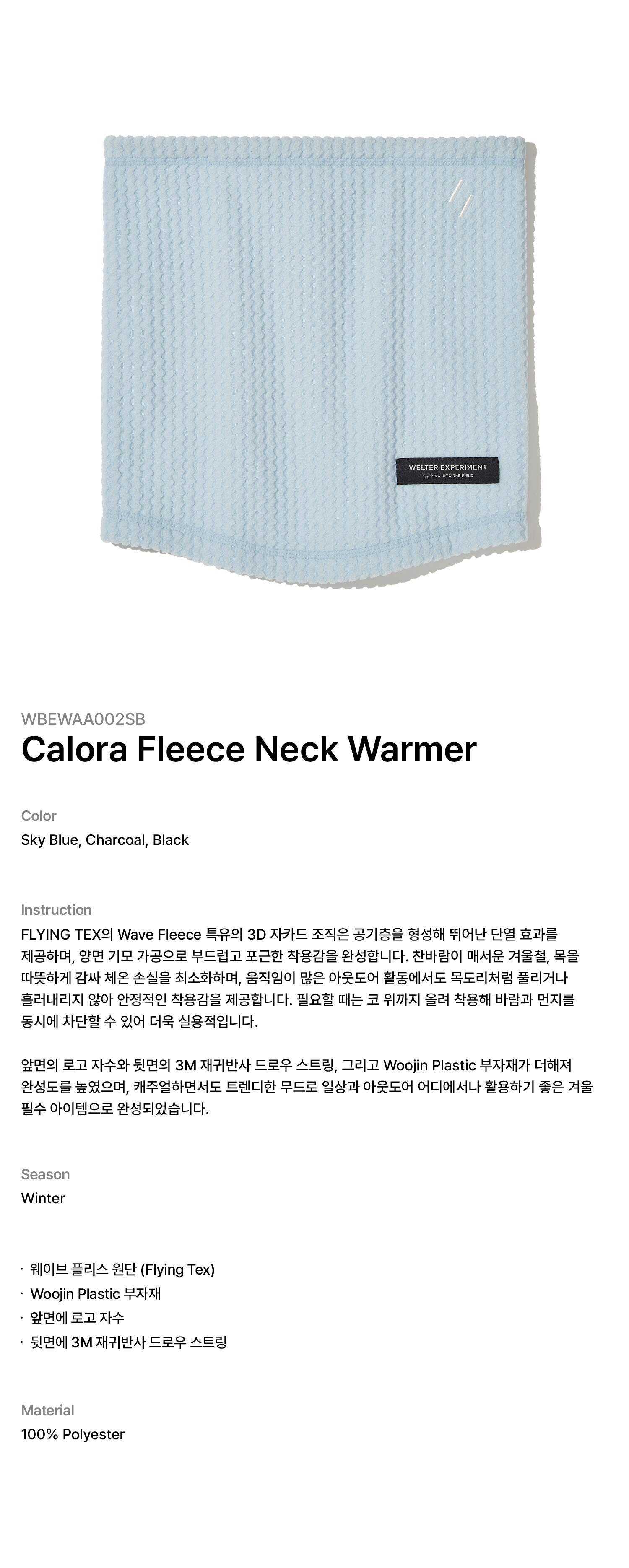 'FLYING TEX의 Wave Fleece 특유의 3D 자카드 조직은 공기층을 형성해 뛰어난 단열 효과를 제공하며, 양면 기모 가공으로 부드럽고 포근한 착용감을 완성합니다. 찬바람이 매서운 겨울철, 목을 따뜻하게 감싸 체온 손실을 최소화하며, 움직임이 많은 아웃도어 활동에서도 목도리처럼 풀리거나 흘러내리지 않아 안정적인 착용감을 제공합니다. 필요할 때는 코 위까지 올려 착용해 바람과 먼지를 동시에 차단할 수 있어 더욱 실용적입니다.