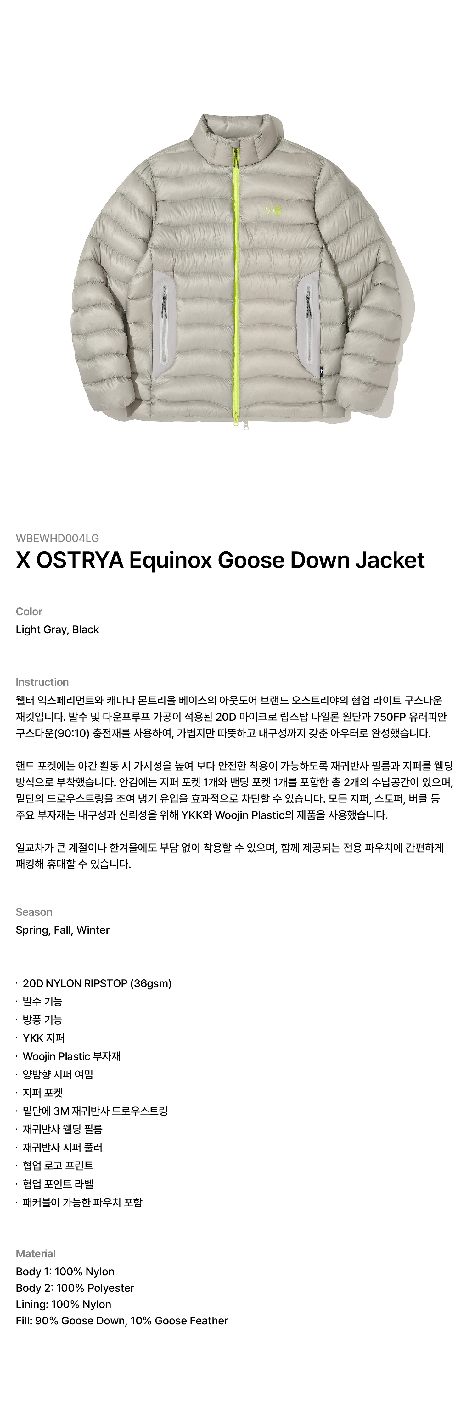 '웰터 익스페리먼트와 캐나다 몬트리올 베이스의 아웃도어 브랜드 오스트리야의 협업 라이트 구스다운 재킷입니다.