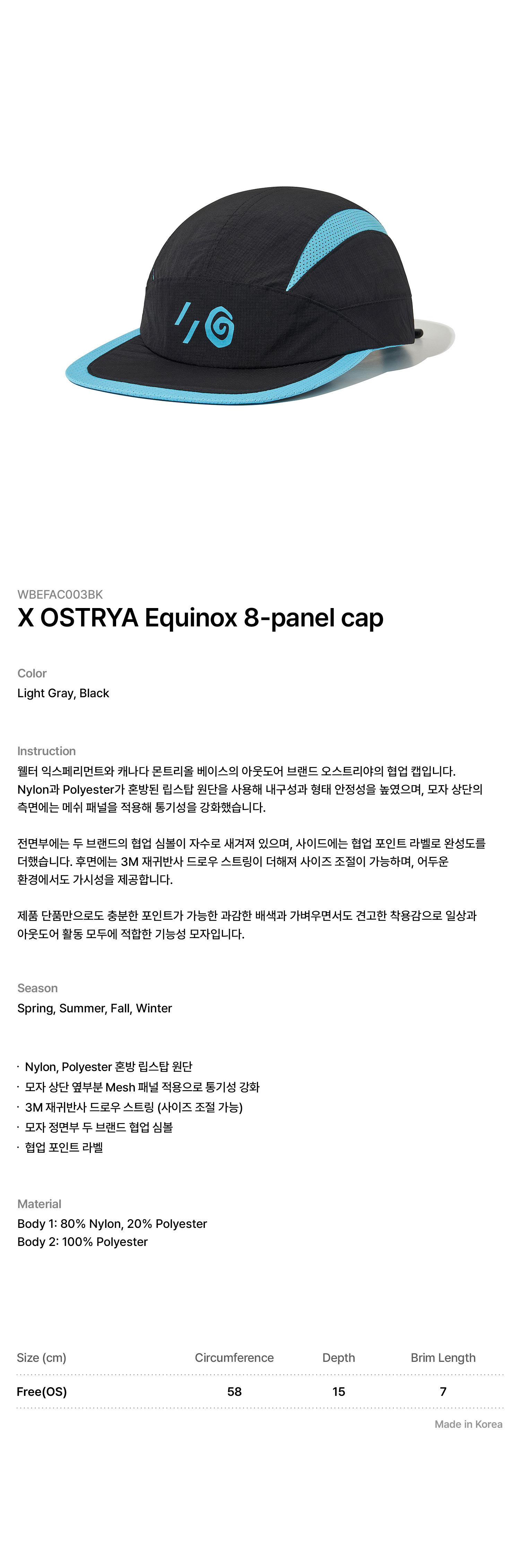 제품 단품만으로도 충분한 포인트가 가능한 과감한 배색과 가벼우면서도 견고한 착용감으로 일상과 아웃도어 활동 모두에 적합한 기능성 모자입니다.
