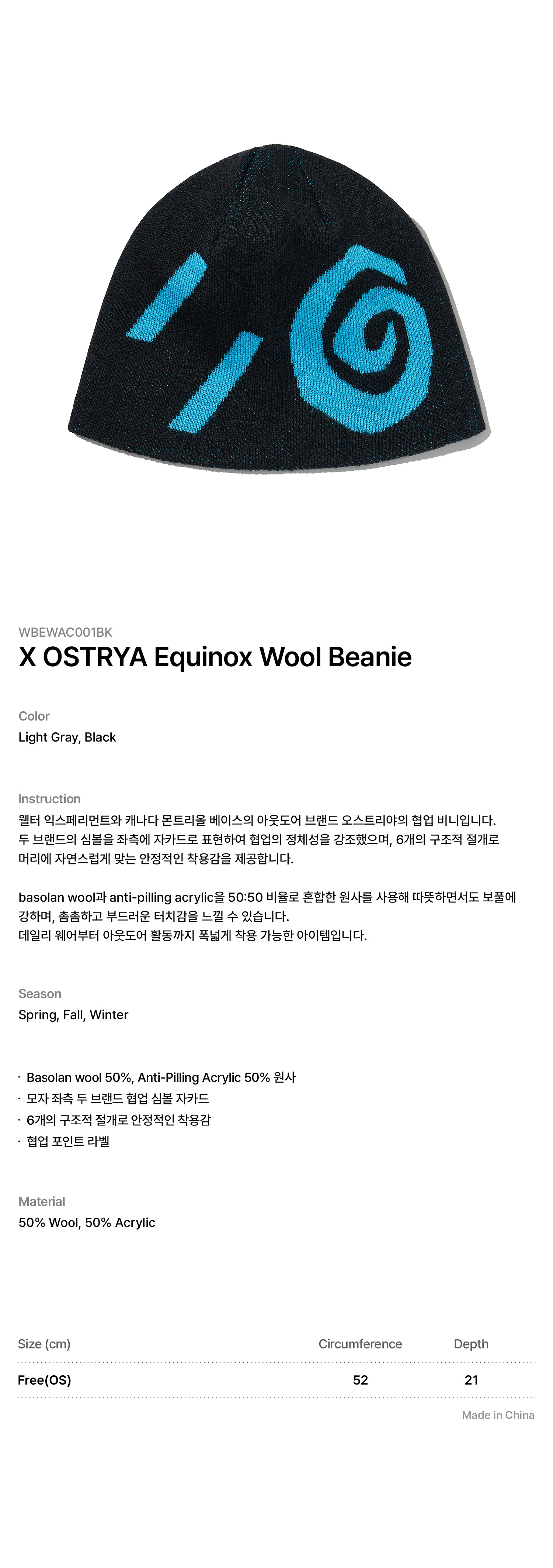 '웰터 익스페리먼트와 캐나다 몬트리올 베이스의 아웃도어 브랜드 오스트리야의 협업 비니입니다.